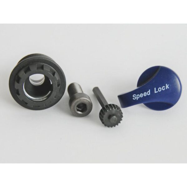 W zestawie jest: czarny wkręcany korek w goleń, śrubka inbusowa, zębatka oraz pokrętło blokady w kolorze niebieskim.